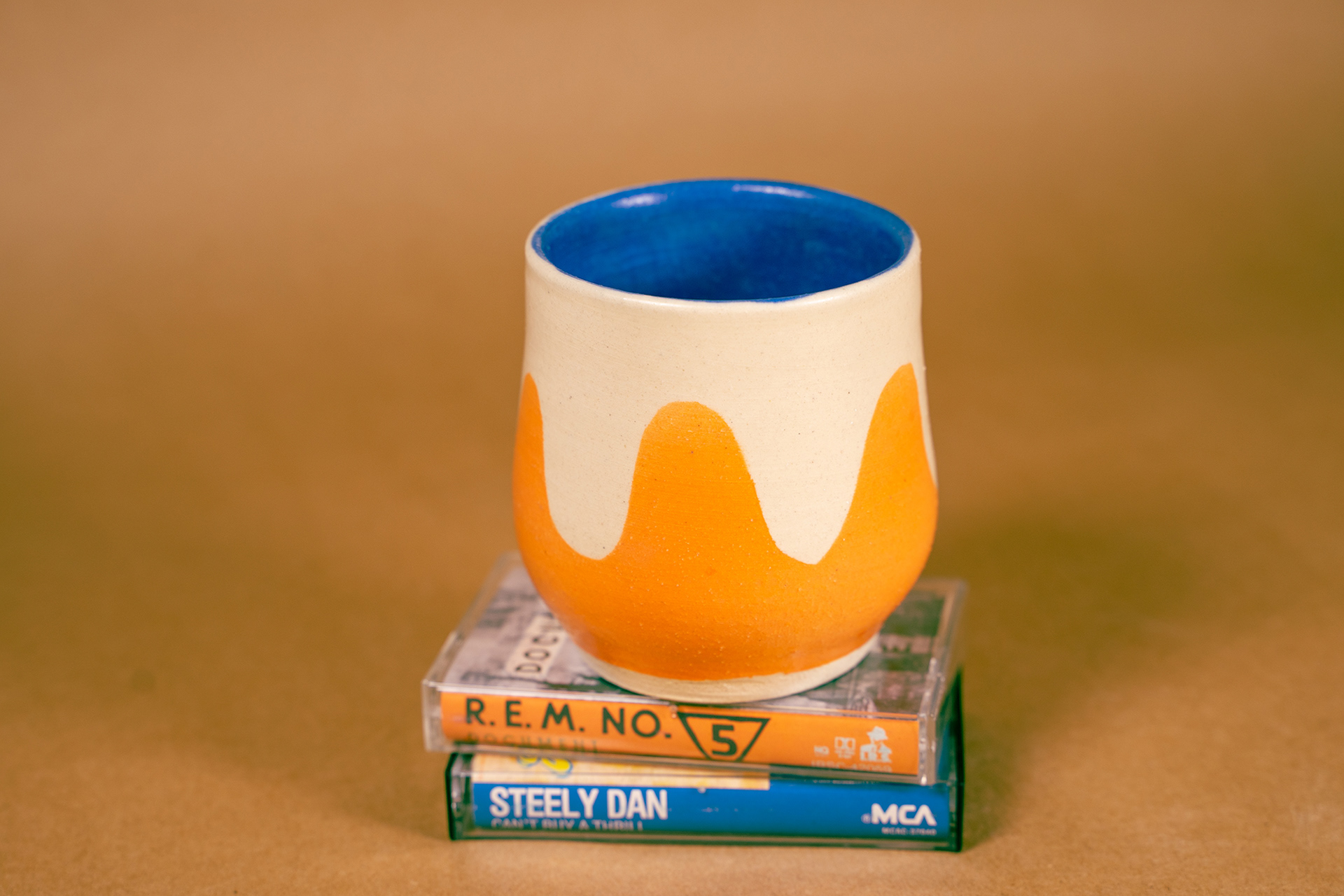 cup // white clay body // satin matte finish // orange and blue underglaze