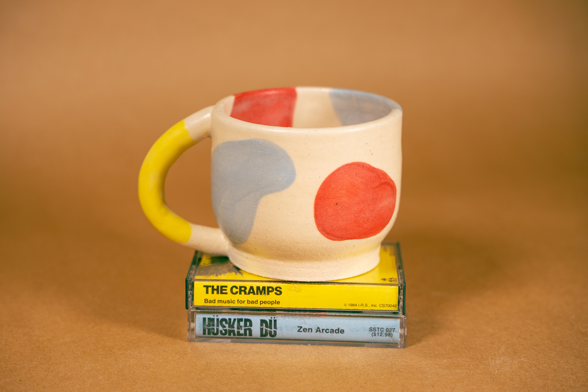 mug // white clay body // satin matte finish // red, yellow, and light blue underglaze