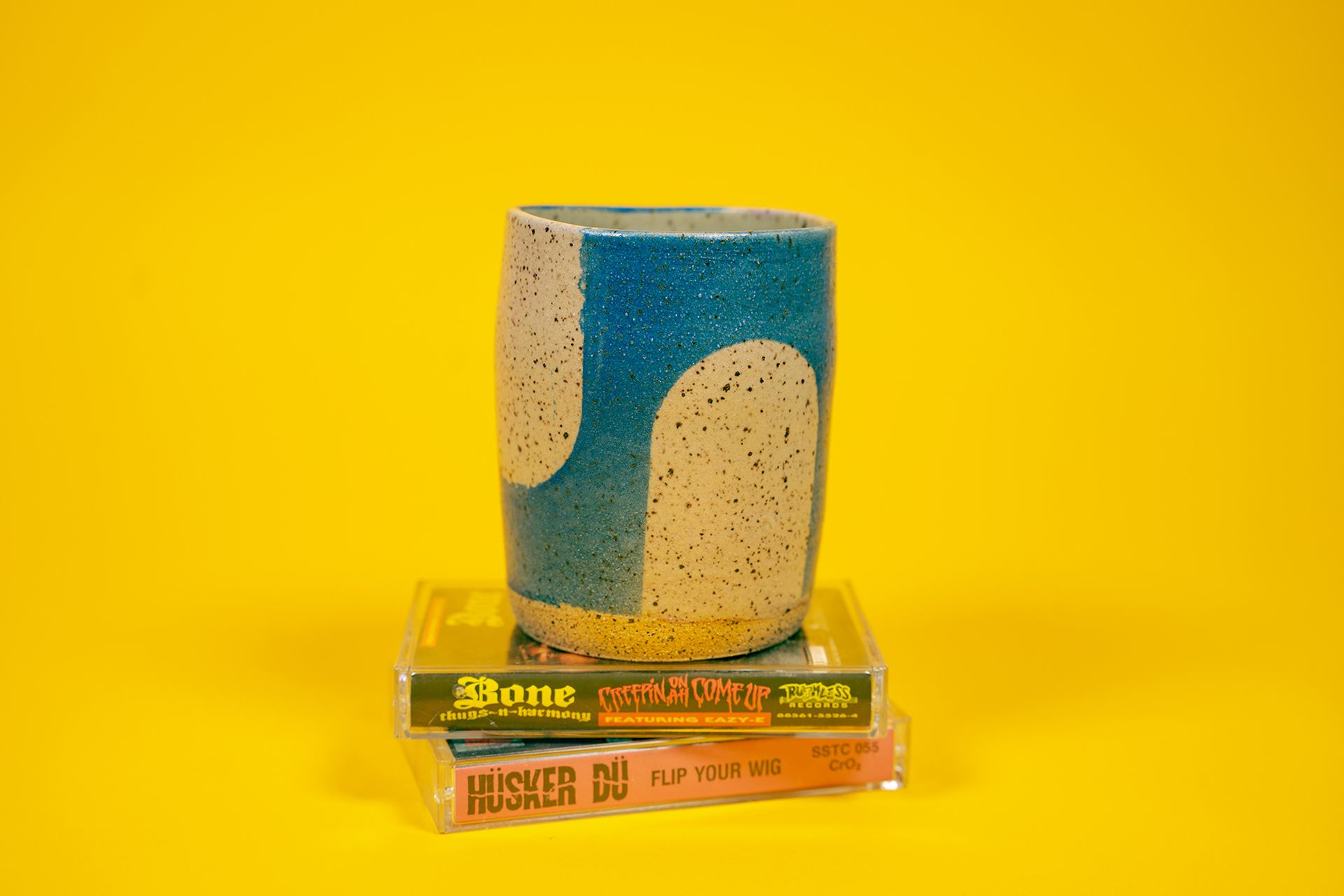 cup // speckled buff clay body // satin matte finish // orange and black underglaze