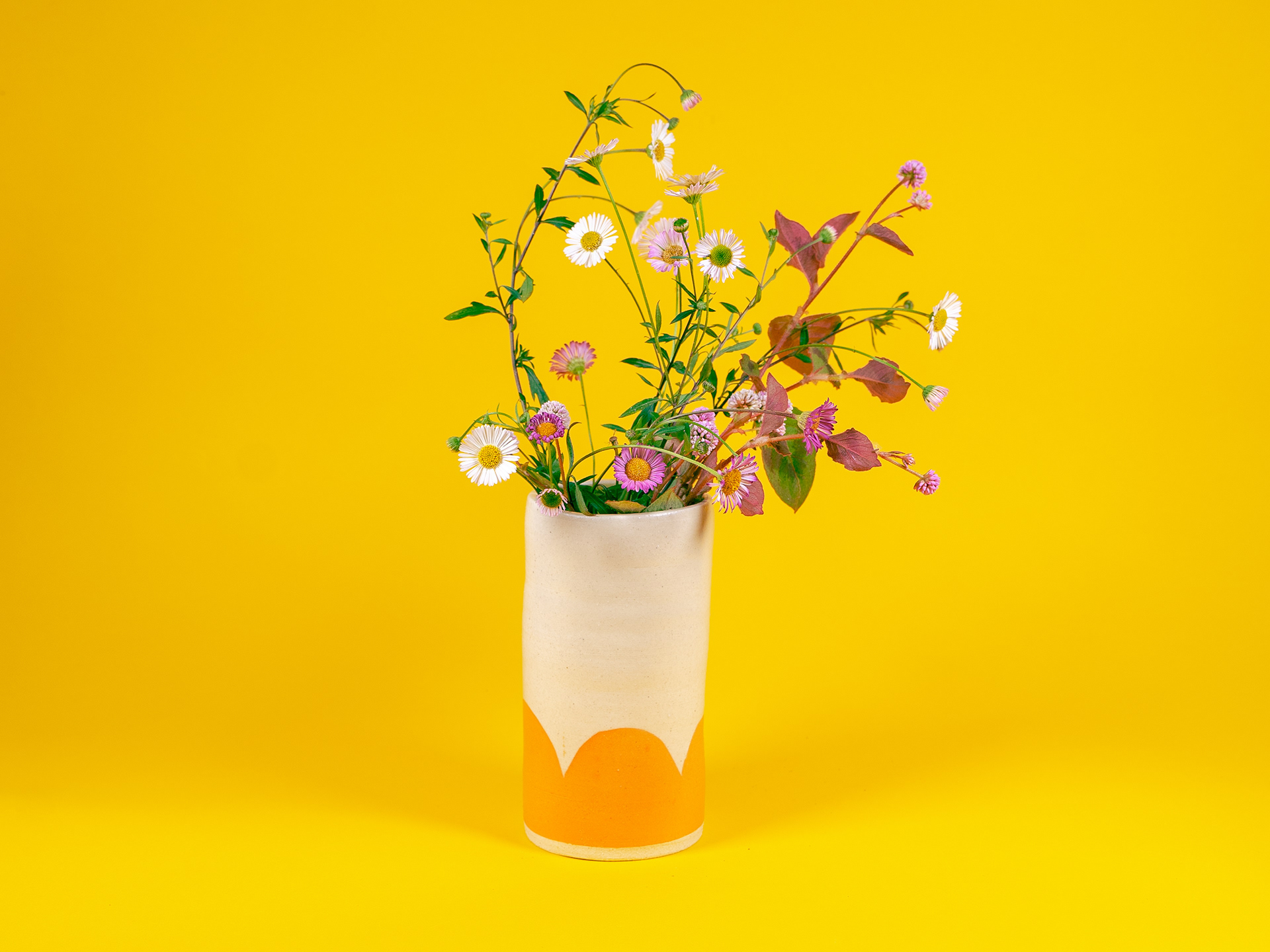 vase // white clay body // satin matte finish // orange and yellow underglaze